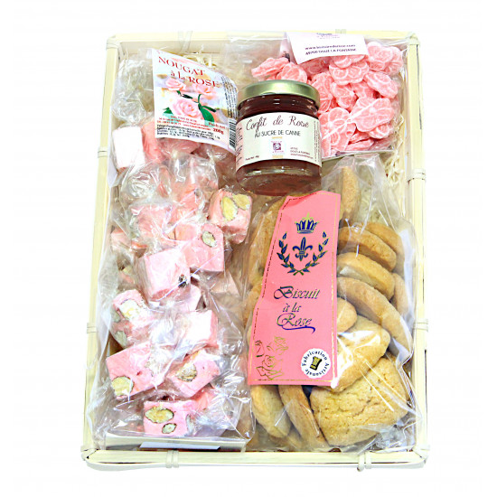 Ingrédients : sucre, amandes, miel, sirop de glucose, pistaches, albumine d'oeuf, pain azyme, pétales de roses anciennes, huile essentielle de rose, eau florale de rose
